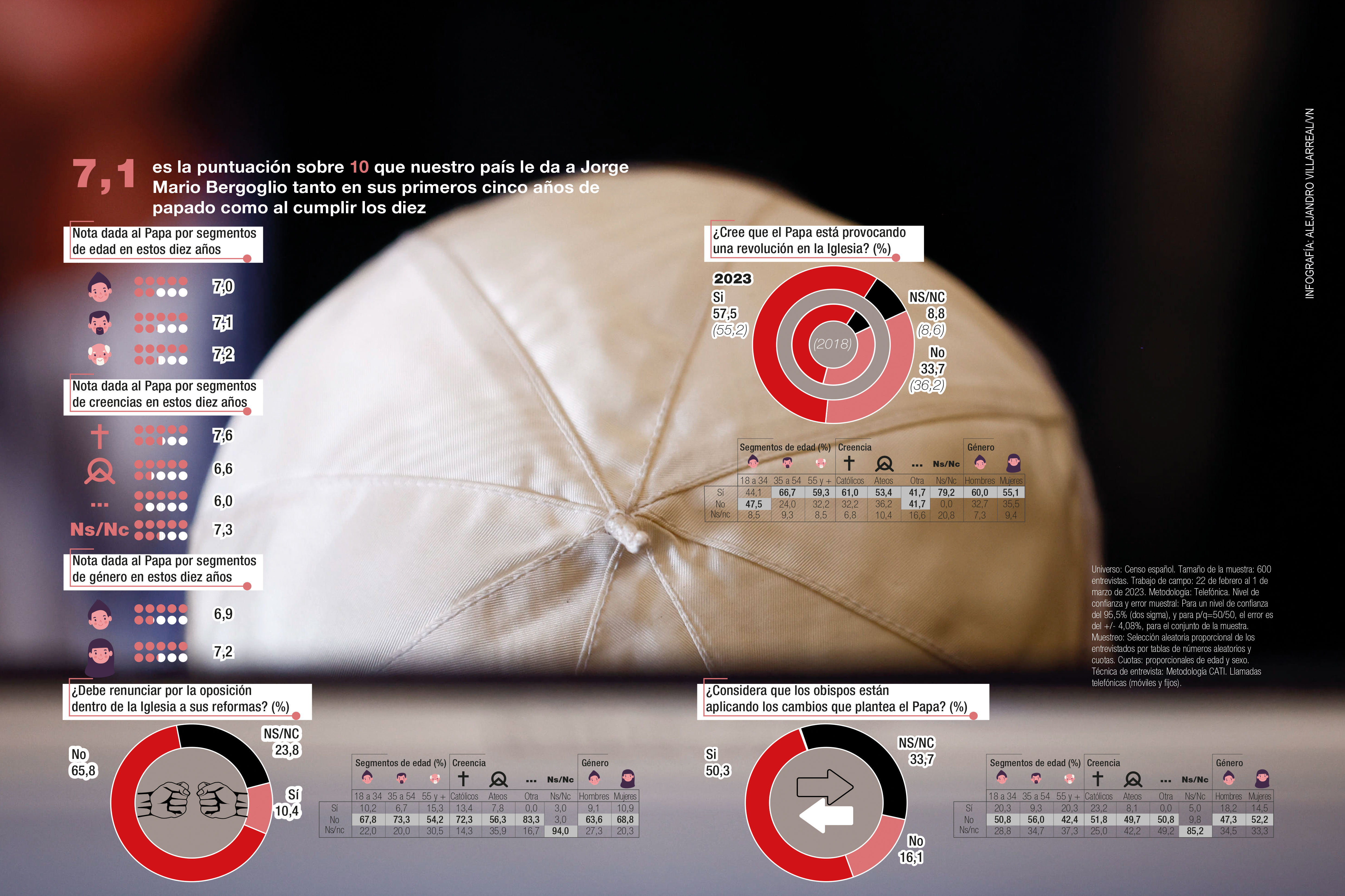 Estratificando por edades, las diferencias no son notables. Eso sí, Francisco es tímidamente mejor visto por las mujeres (7,2) que por los hombres (6,9). La mayor disparidad se encuentra cuando se segmenta por creencias. Los católicos, más conocedores de las reformas y su papel como sucesor de Pedro, le otorgan la máxima calificación: un 7,6. De hecho, obtiene un 0,3 más que hace un lustro. Esta baja un punto entre los que se declaran ateos o agnósticos, hasta el 6,6; aun así, es un punto más que hace cinco años. Eso sí, es mejor visto por los no creyentes que por los que se confiesan creyentes de otras religiones, que le dan un 6 raspado. Por tanto, la popularidad del Papa aumenta entre católicos y ateos.