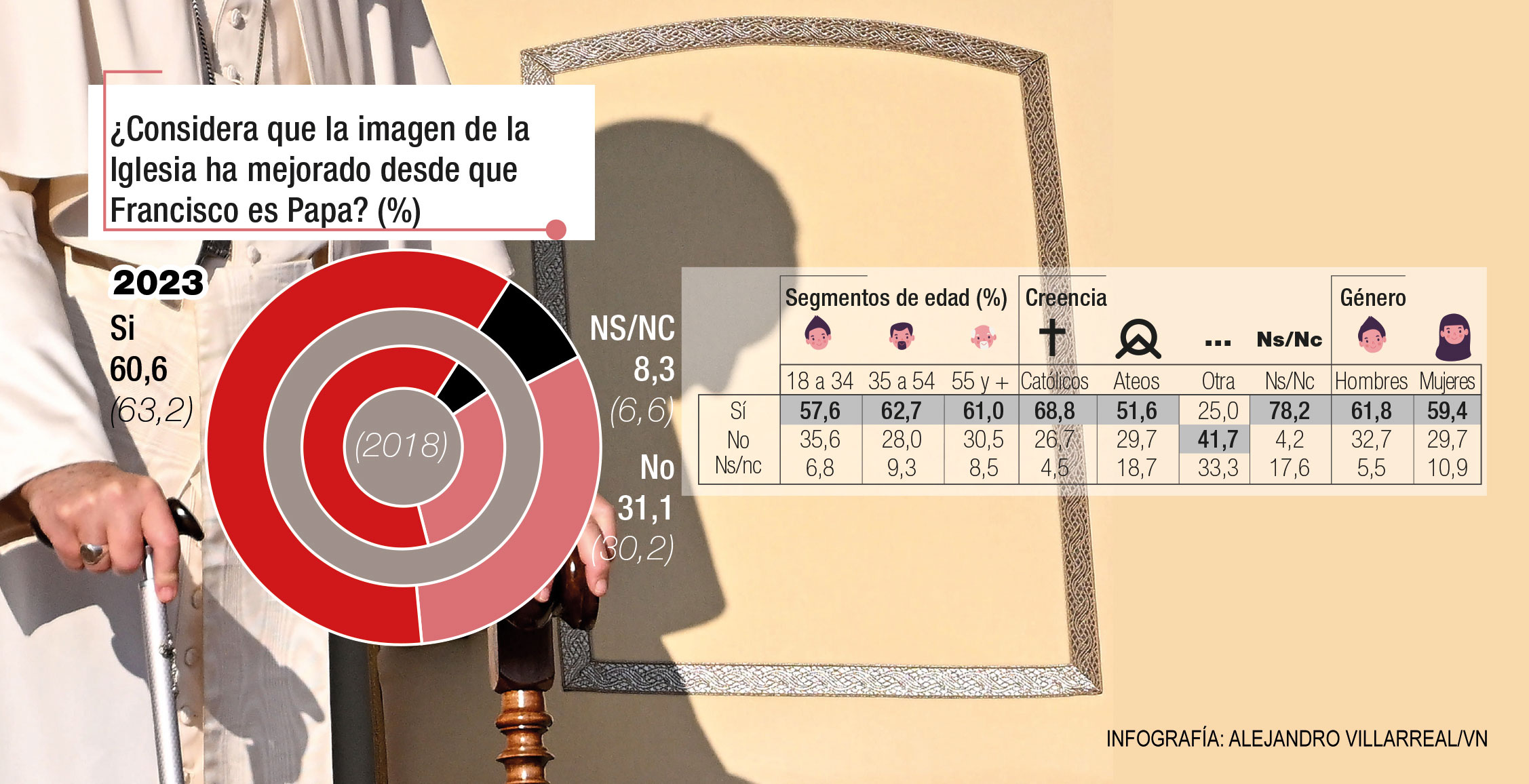 La cercanía del Papa argentino le ha valido el cariño de las masas. Pero ¿es suficiente esto para mejorar la imagen de la Iglesia? Aparentemente sí, pues el 60,6% considera que la imagen de la institución ha mejorado en estos diez años, por el 31,1% que no lo ve así. Sin embargo, son los jóvenes (57,6%) los más escépticos a la hora de considerar que la imagen de Francisco también cambia la de la institución. Más halagüeños son los de 35 a 54 años (62,7%) y los mayores de 55 (61%). En este sentido, son los de casa los que han visto mejorada en mayor grado la imagen de la Iglesia gracias a este pontificado, situándose en un 68,8%, por el 51,6% de los ateos y el 25% de los creyentes de otras confesiones.
