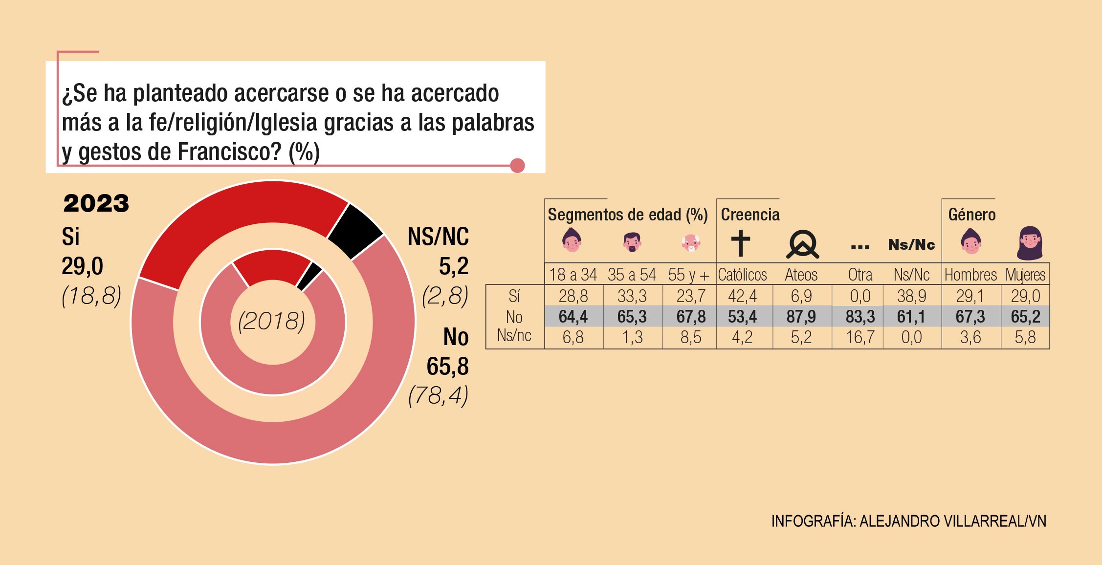 Eso sí, este estudio pone de manifiesto que el testimonio de Francisco evangeliza. Mientras que hace cinco años, solo el 18,9% de los españoles admitía haberse planteado acercarse o se había acercado más a la Iglesia gracias a las palabras y gestos de Francisco, la realidad es que hoy esta cifra crece más de 10 puntos hasta alcanzar el 29%. Por el contrario, el 65,8% no ha sentido la llamada pese a valorar cada vez más la figura del obispo de Roma. Si tenemos en cuenta la edad de los encuestados, no son los jóvenes (28,8%) los que menos se acercan, sino los mayores de 55 años (23,7%). Por encima quedan los de 35 a 54 años, con un 33,3%. Por otro lado, sí es cierto que mientras que en 2018 un 20,9% de los católicos admitían haberse acercado más, esa cifra se ha duplicado cinco años después hasta el 42,4%. Por su parte, aunque poco, también crecen los ateos que han tocado las puertas, que pasan del 6,7% al 6,9%.