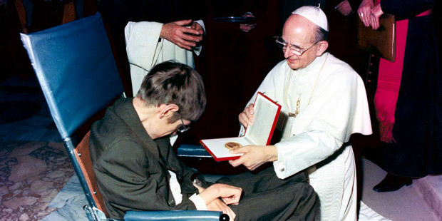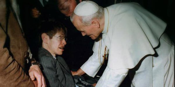 A Montini le saludó en el Vaticano el 9 de abril de 1975 con motivo de serle concedida por la Santa Sede la Medalla Pío XI. El científico británico tenía entonces 33 años y llevaba una década padeciendo su enfermedad (pese a que le diagnosticaron uno o dos años de vida, alargó su existencia medio siglo más), estando ya en silla de ruedas. De ese encuentro entre ambos queda la significativa imagen del Papa arrodillado durante dos minutos ante Hawking.