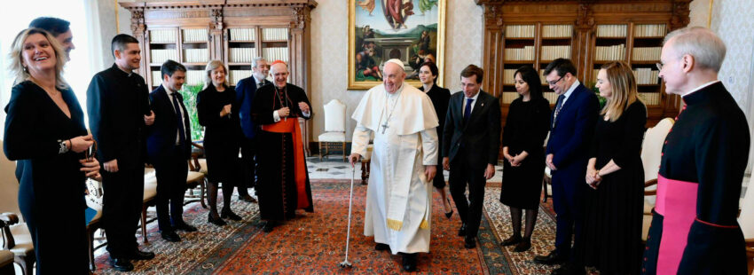 Quienes acompañaban a Osoro en este encuentro con el Papa, en el marco del Año Jubilar de San Isidro y cuarto centenario de su canonización, eran la presidenta de la Comunidad de Madrid, Isabel Díaz Ayuso; el alcalde de la capital, José Luis Martínez-Almeida -“Ah, usted es el heredero de la gran Manuela Carmena”, le ha dicho Francisco al saludarle-; y la delegada del Gobierno en Madrid, Mercedes González. Con ellos se ha sentado para dirigirles unas palabras –un gesto que no suele ser habitual pero que ya llevó a cabo con Pedro Sánchez– en las que ha hecho especial hincapié en la necesidad de dejar de lado las ideologías en favor de trabajar por el bien del pueblo.