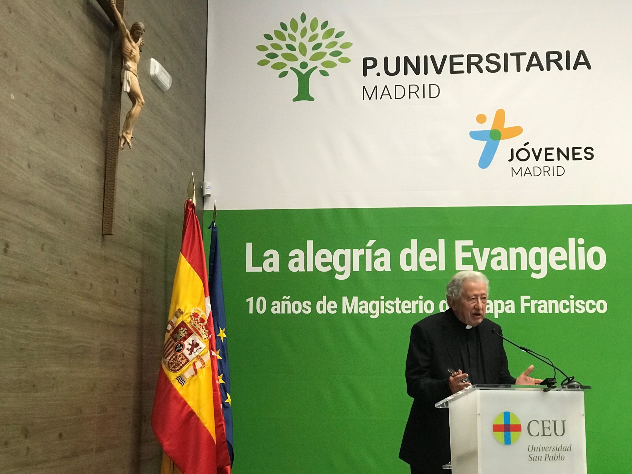 Así lo manifestó como responsable de alocución de apertura del congreso ‘La alegría del Evangelio’, que arrancó esta tarde en el aula magna de la facultad de Económicas de la Universidad San Pablo CEU. Organizado por el Secretariado de Pastoral Universitaria de la Archidiócesis de Madrid de la mano de la Fundación San Pablo CEU, este foro de reflexión busca ahondar en el magisterio del Papa.