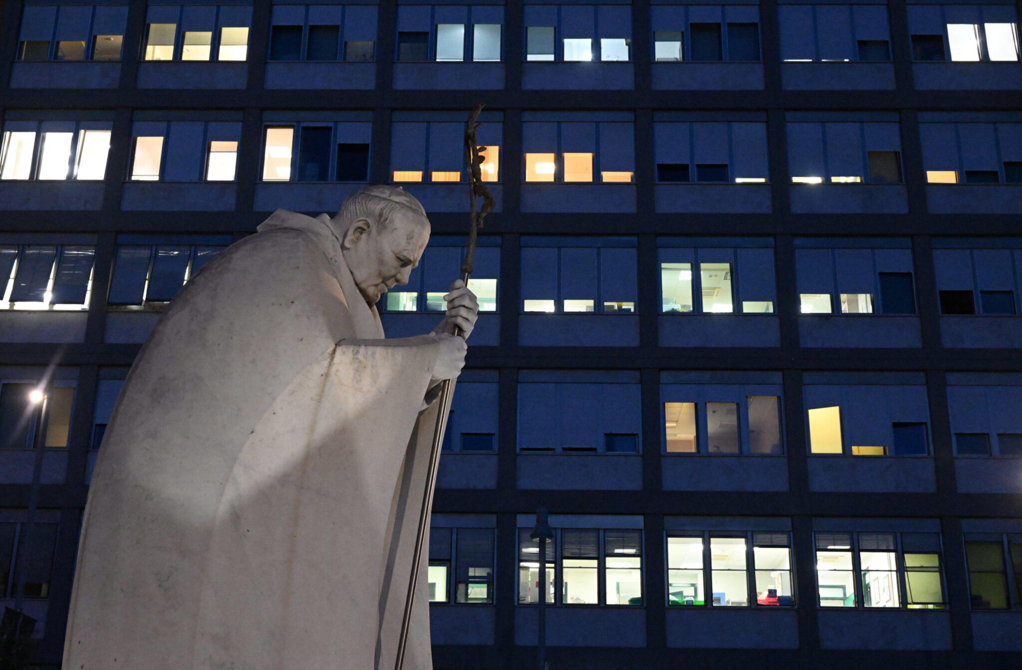 Rome (Italy), 29/03/2023.- A statue of late Pope St. John Paul II in front of the Agostino Gemelli hospital in Rome, Italy, 29 March 2023. Pope Francis is hospitalized following a respiratory infection (excluding the Covid 19 infection) which will require a few days of appropriate hospital medical therapy, according to the Vatican. (Papa, Italia, Roma) EFE/EPA/CLAUDIO PERI