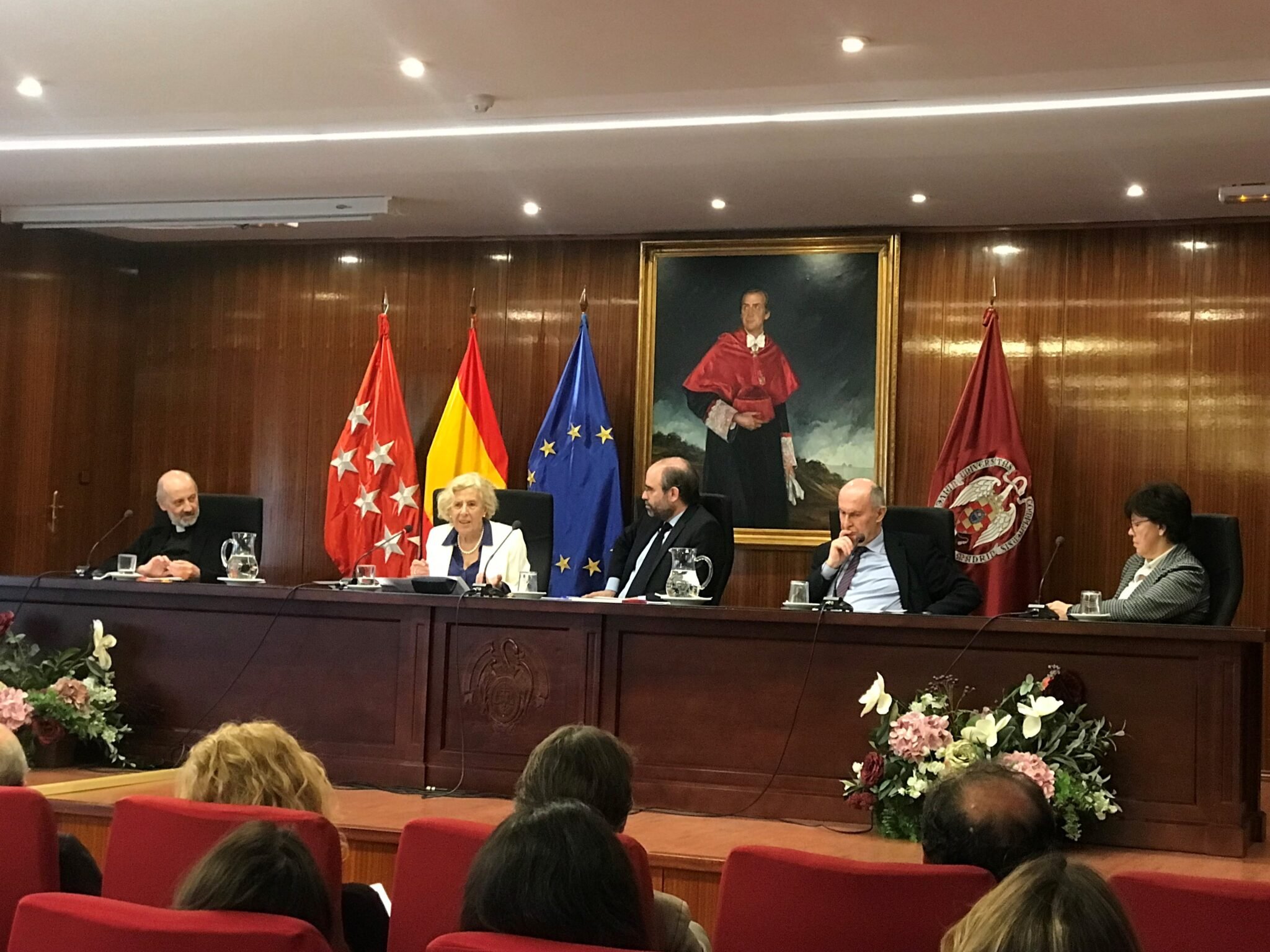 Carmena dialogó en un mano a mano con el filósofo y biógrafo intelectual del Papa, Massimo Borghesi. Junto a ellos se encontraban el decano de facultad, Ricardo Alonso García; la delegada de Jóvenes de la Archidiócesis de Madrid, Laura Moreno; y el capellán de la facultad, Hilario Mendo.
