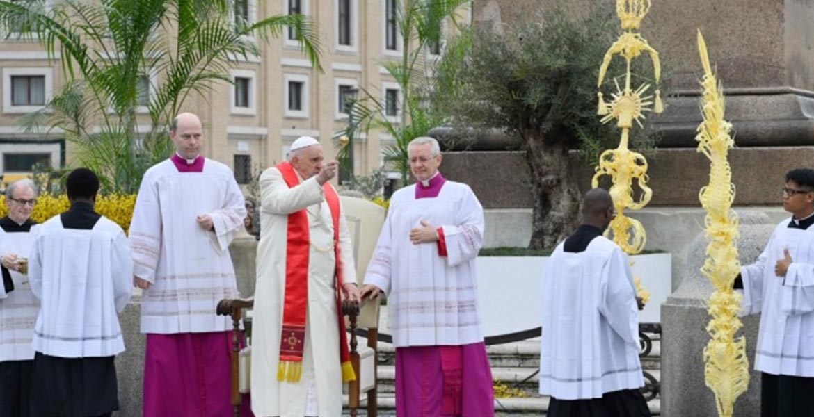 Tras pasar tres noches en el hospital Gemelli de Roma, el papa Francisco ha presidido la eucaristía del Domingo de Ramos en la Pasión del Señor en la Plaza de San Pedro. Como hiciera ya en la Semana Santa de 2022, el pontífice ha presidido los ritos iniciales, aunque en esta ocasión se ha desplazado junto al obelisco central en un coche panorámico, en lugar de permanecer en el atrio como el año pasado. El pontífice, con una estola simple sobre el abrigo papal, la dulleta, ha introducido la celebración y bendecido los ramos de olivo.