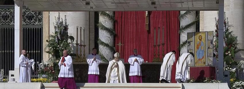 La celebración de la misa ha comenzado con un rito particular de la misa papal: el ‘Resurrexit’. Durante el canto, al comienzo de la celebración, los diáconos abrían las portezuelas de un icono bizantino de la Resurrección –el llamado icono ‘Acheropita’, es decir, no pintado por mano humana, que se encuentra en la basílica de San Juan de Letrán–. Este símbolo, de claro sabor oriental, recuerda a Pedro como primer testigo de la Resurrección y por eso se repite ante el Papa, sucesor del príncipe de los apóstoles. También se ha proclamado el evangelio en latín y en griego. Y es que en esta ocasión la liturgia papal remarca la coincidencia de fecha con la primera luna nueva de primavera para celebrar el día de la Pascua.