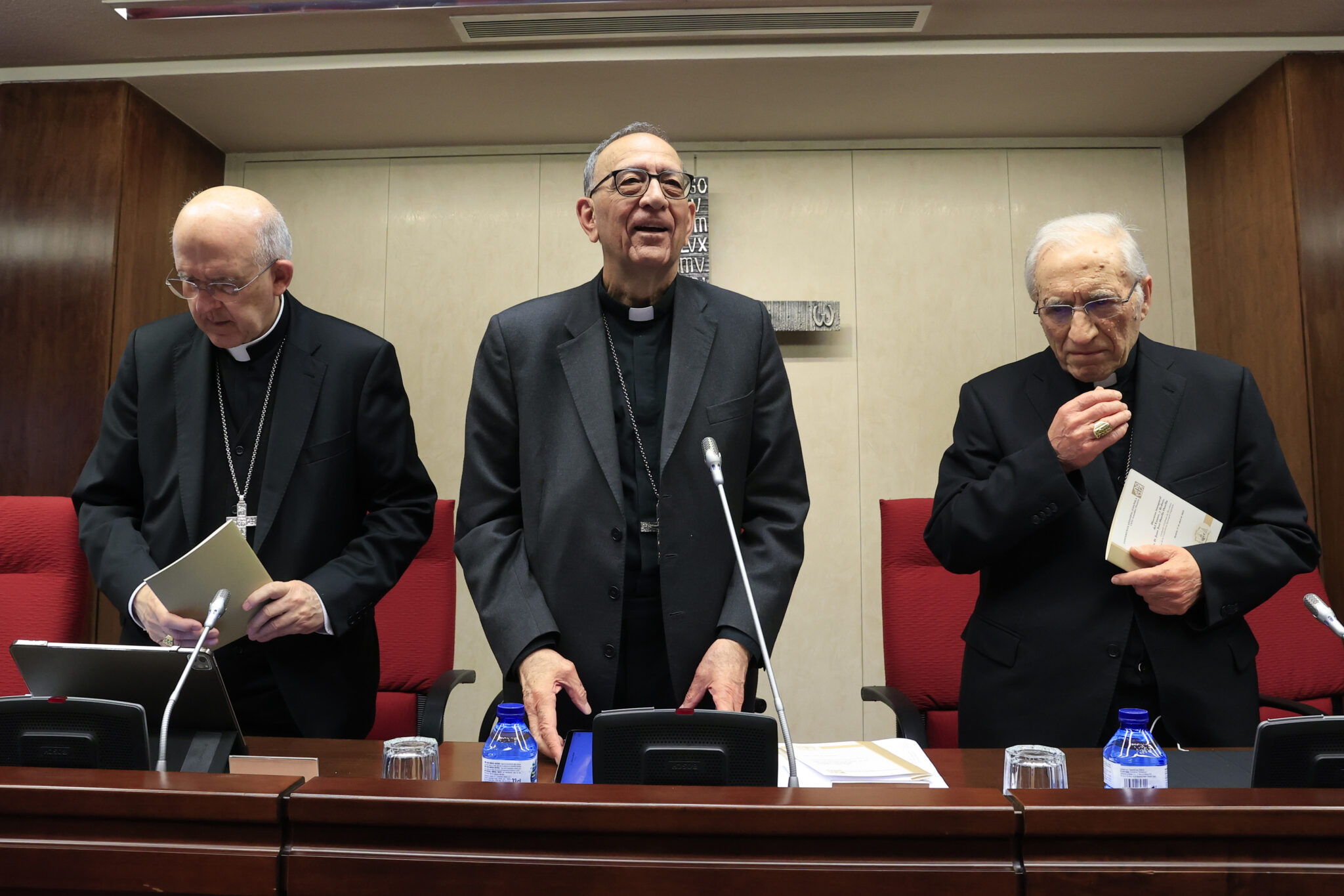 MADRID, 17/04/2023.- El presidente de la Conferencia Episcopal Española (CEE), Juan José Omella (c), y el nuncio apostólico en España, Bernardito Auza (i), y el cardenal Rouco Varela (d), participan en la sesión inaugural de la 121º Asamblea Plenaria de los obispos españoles celebrada en Madrid, este lunes. EFE/ Zipi