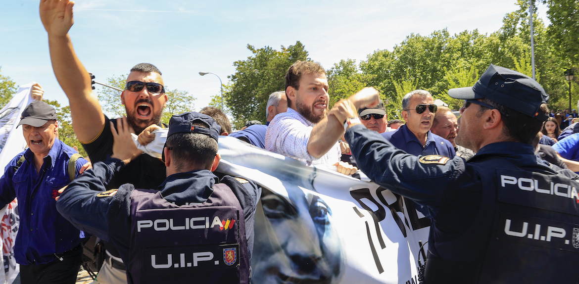 -FOTODELDIA- MADRID, 24/04/2023.- Simpatizantes de Falange se enfrentan a la policía en las inmediaciones del cementerio de San Isidro la llegada de los restos mortales del fundador de la Falange, José Antonio Primo de Rivera, tras su exhumación del Valle de Cuelgamuros este lunes. EFE/Zipi