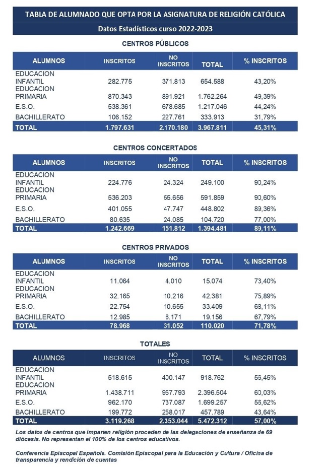 Con los datos en la mano de 69 diócesis, la materia confesional cuenta actualmente con 3.119.268 estudiantes, lo que supone el 57% del total sobre el que se ha elaborado esta estadística. A la luz de estos datos, ha descendido 2,8% el alumnado con respecto al año anterior. En el caso de los centros públicos la bajada es del 2,5%, en los colegios privados, un 3,5%, mientras que la escuela concertada apenas ha descendido un 0,5%.