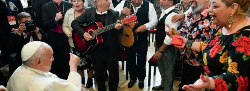 Al final del encuentro de esta mañana de Francisco con los pobres y refugiados un festivo coro de gitanos le cantó una ancestral canción de su pueblo. Antes de iniciarla le preguntaron: “¿Podemos bendecirle?”, a lo que el papa respondió con un sí tan espontáneo como decidido. Ellos le explicaron que la letra era una bendición y con su guitarra y vestidos con sus vistosos trajes hombres y mujeres alegraron la fiesta y pusieron un nota de exotismo en tan solemne contexto gótico-litúrgico.