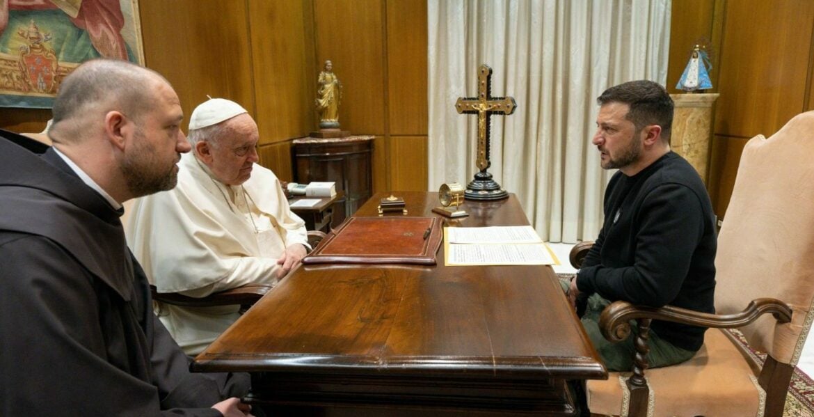 La reunión de cuarenta minutos que esta tarde han mantenido el Papa Francisco y el presidente ucraniano, Volodomir Zelenski, deja tras de sí innumerables detalles de cercanía y cordialidad. El primero de ellos es el saludo alejado de todo formalismo entre ambos a la entrada del aula Pablo VI, donde el mandatario llegó a las cuatro de la tarde a bordo de un coche blindado.