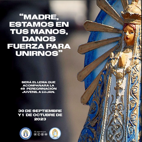 El próximo sábado 30 de septiembre y domingo 1° de octubre se realizará la tradicional peregrinación a pie a Luján. Este año el lema convocante será: “Madre, estamos en tus manos, danos fuerza para unirnos”.