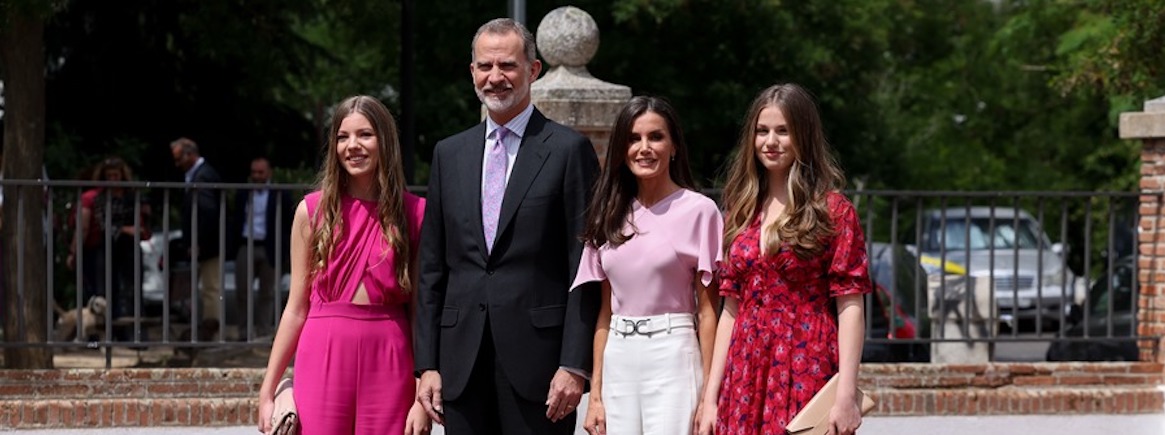 Spanish King Felipe VI (2L) and Queen Letizia (2R) poses with their daugthers, Princess Leonor (R) and infanta Sofia (L) at their arrival to Asuncion's Church in Madrid, Spain on 25 May 2023 where infanta Sofia receives the initiation sacrament of confirmation. EFE/ Ballesteros