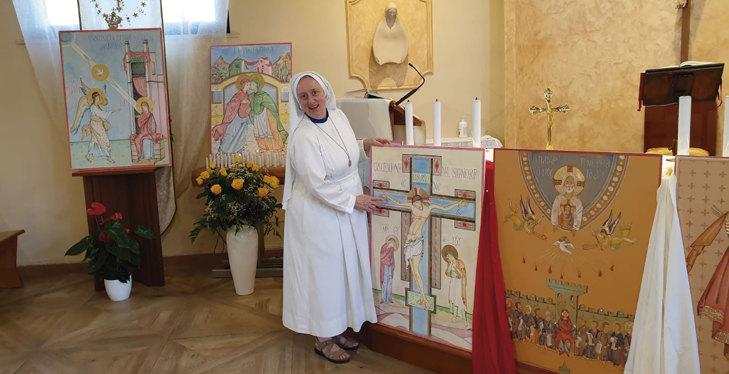 En este lugar que parece alejado del tiempo, el rector, al final de la liturgia después de bendecir a los fieles y como si fuera uno de ellos, se sienta en los bancos a escuchar. Sor Maria Giuseppina Di Salvatore suba al altar y comienza a hablar sobre uno de los iconos realizados por ella misma y que guarda en el campanario. Sus creaciones son imágenes que tienen el poder de atraer inmediatamente la mirada y el espíritu y, como todos los iconos, no solo aportan belleza, sino que sirven para orar.