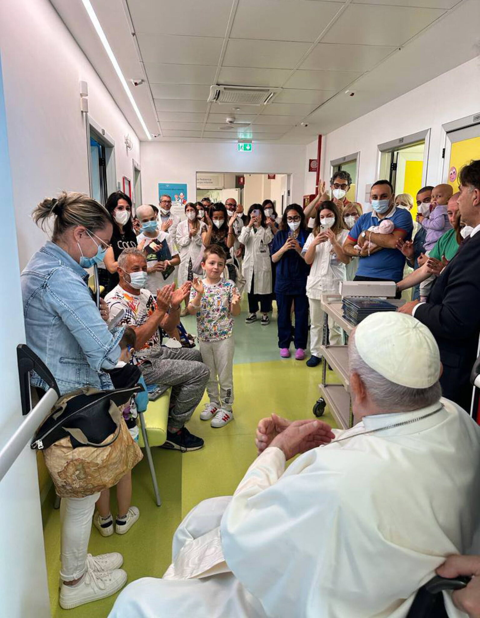 La Oficina de Prensa del Vaticano certifica esta visita con la publicación de unas imágenes en las que se ve a Francisco, sentado en su silla de ruedas, bendiciendo a los niños, a sus padres, a otros enfermos y al personal médico. Estas fotos son las primeras que se distribuyen del pontífice después de su intervención.