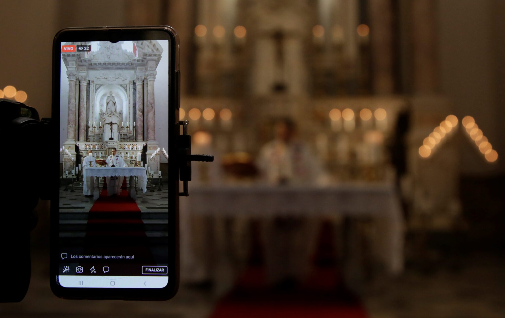 -FOTODELDIA- AME1596. CARTAGENA (COLOMBIA), 09/04/2020.- Un teléfono celular graba al padre Jesuita Jorge Camacho, párroco del Santuario de San Pedro Claver de Cartagena, durante la eucaristía de la cena de Jesús, con motivo de la celebración de este Jueves Santo, frente a una iglesia vacía y sin feligreses por prevención a la expansión del contagio del Covid-19, en Cartagena (Colombia). En el Santuario, que es sede nacional de los Derechos Humanos, trasmitieron la celebración de la santa misa por internet y conmemoraron también el Día Nacional de la Memoria y Solidaridad con las Víctimas. EFE/ Ricardo Maldonado Rozo