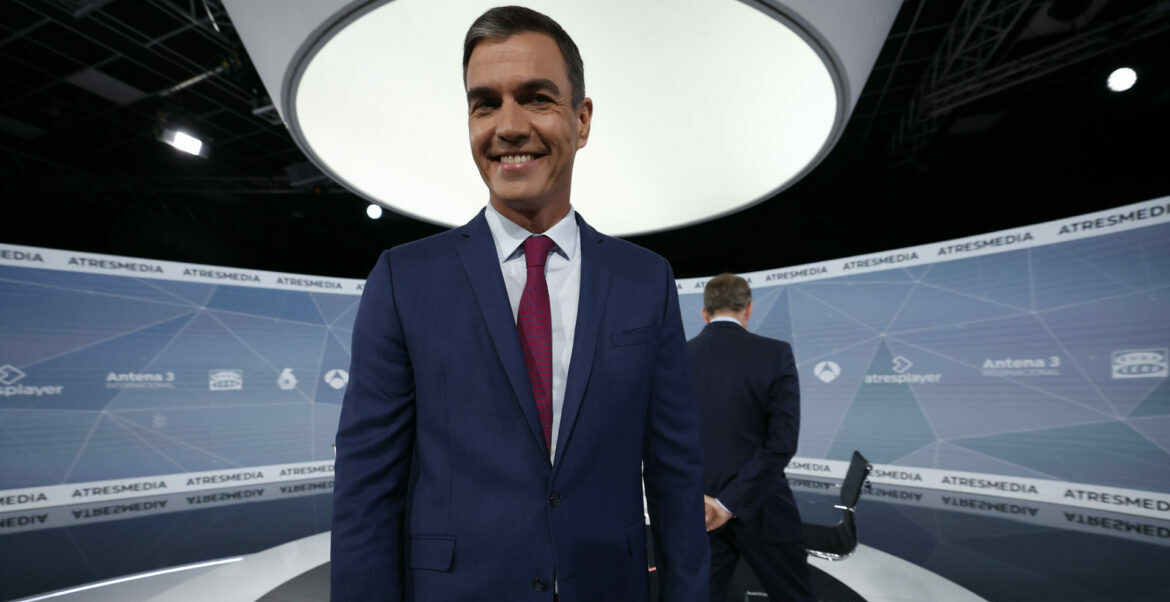 MADRID , 10/07/2023.- Los candidatos a la presidencia del Gobierno, el socialista Pedro Sánchez (primer plano) y el popular Alberto Núñez Feijoo (detrás), antes de iniciar el debate electoral hoy lunes en Madrid. EFE/ Juanjo Martín.