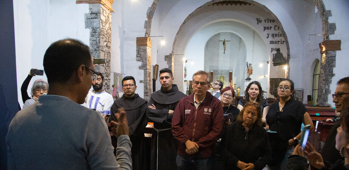 El historiador y coordinador de Estudios Cuenca de México, Horacio Báez Jiménez, ofreció un recorrido por las cinco salas que conforman el museo que narra la historia que comenzó el 13 de agosto de 1523, cuando llegaron a estas tierras los tres primeros frailes franciscanos en calidad de capellanes: Pedro de Gante, Juan de Tecto y Juan de Aora.