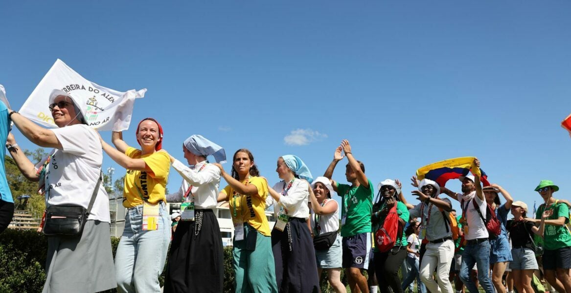 Lisboa (Portugal), 01/08/2023.- Pilgrims sing and dance on the first day of the World Youth Day (WYD) in Lisbon, Portugal, 01 August 2023. The Pontiff will be in Portugal on the occasion of World Youth Day (WYD), one of the main events of the Church that gathers the Pope with young people from around the world. WYD 2023 will run from 01 to 06 August. (Papa, Lisboa) EFE/EPA/MIGUEL A. LOPES