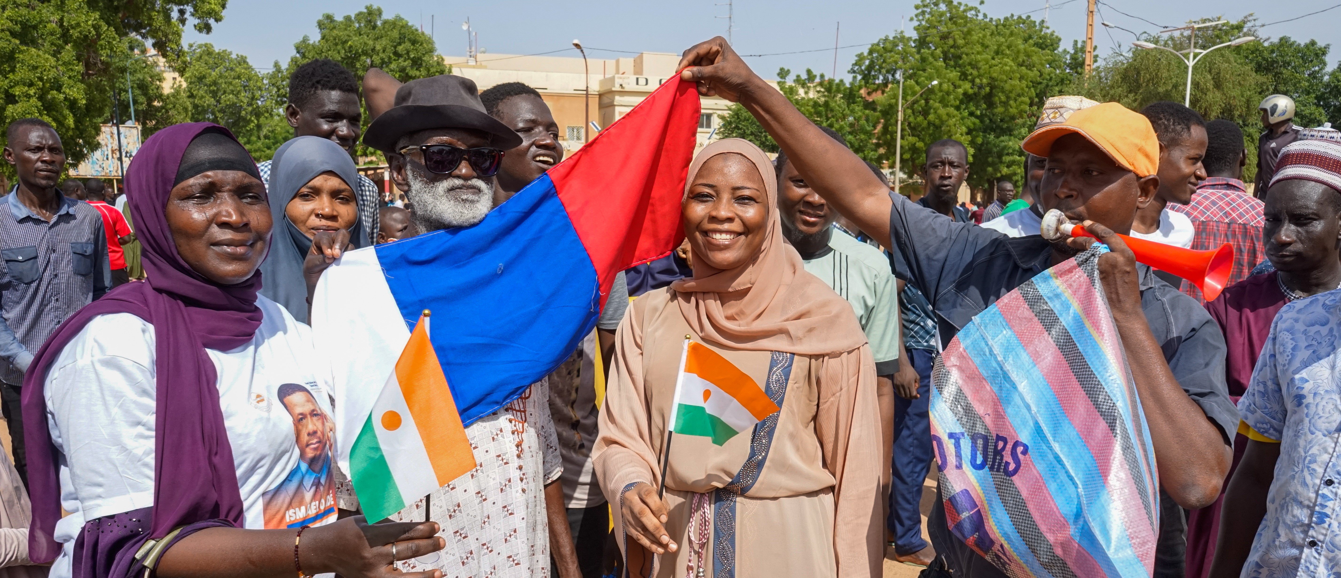 Niger (Niamey), 30/07/2023.- Protesters with a Russian national flag and Niger's flags during a rally in Niamey, Niger, July 30, 2023. Thousands of supporters of General Abdourahamane Tchiani, head of the Presidential Guard, who declared himself the new leader of Niger after a coup against democratically elected President Mohamed Bazoum on 26 July, took to the streets of Niamey to demonstrate in support for the coup. (Protestas, Golpe de Estado, Rusia) EFE/EPA/ISSIFOU DJIBO