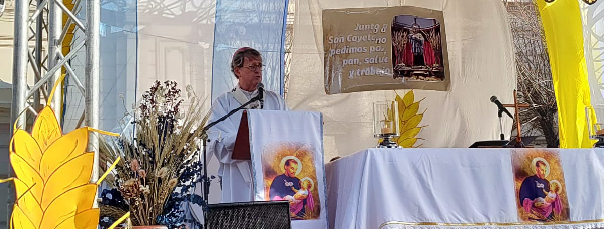 “Hoy San Cayetano estamos pedigüeños: hoy como cada 7 de agosto te pedimos trabajo, pero vamos por más: te pedimos mejor trabajo, te pedimos mejor pan, te pedimos más salud, te pedimos paz para nuestro pueblo; y lo hacemos con mucha fe, a pesar de la exclusión, de la inflación, del desencanto y de los sueños rotos“.