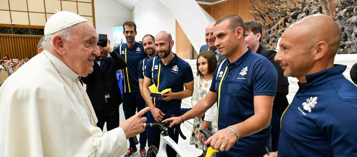 Los ciclistas contaron esta mañana a Francisco su experiencia en la Copa del Mundo, vivida en comunión con la Jornada Mundial de la Juventud en Lisboa. Partiendo de la carrera “Gran Fondo”, reservada para aficionados, en la que Rino Alberto Bellapadrona y Marcus Bergmann pedalearon junto a Masomah Ali Zada, la ciclista afgana del Refugee Team formado por la Unión Ciclista Internacional con atletas de Afganistán, Siria e Irán.