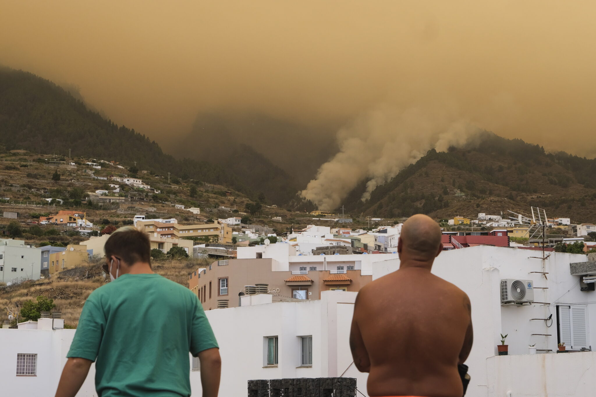 GRAFCAN5781. ARAFO (TENERIFE), 17/08/2023.-El incendio de Tenerife sigue descontrolado, con muchas vertientes y un comportamiento muy dinámico, por lo que se preparan espacios para nuevas evacuaciones en las próximas horas y se cortarán todos los accesos al Parque Nacional del Teide, con el desalojo de turistas e instalaciones del IAC. En la imagen, dos vecinos de Arafo observan el avance del incendio. EFE/Alberto Valdés