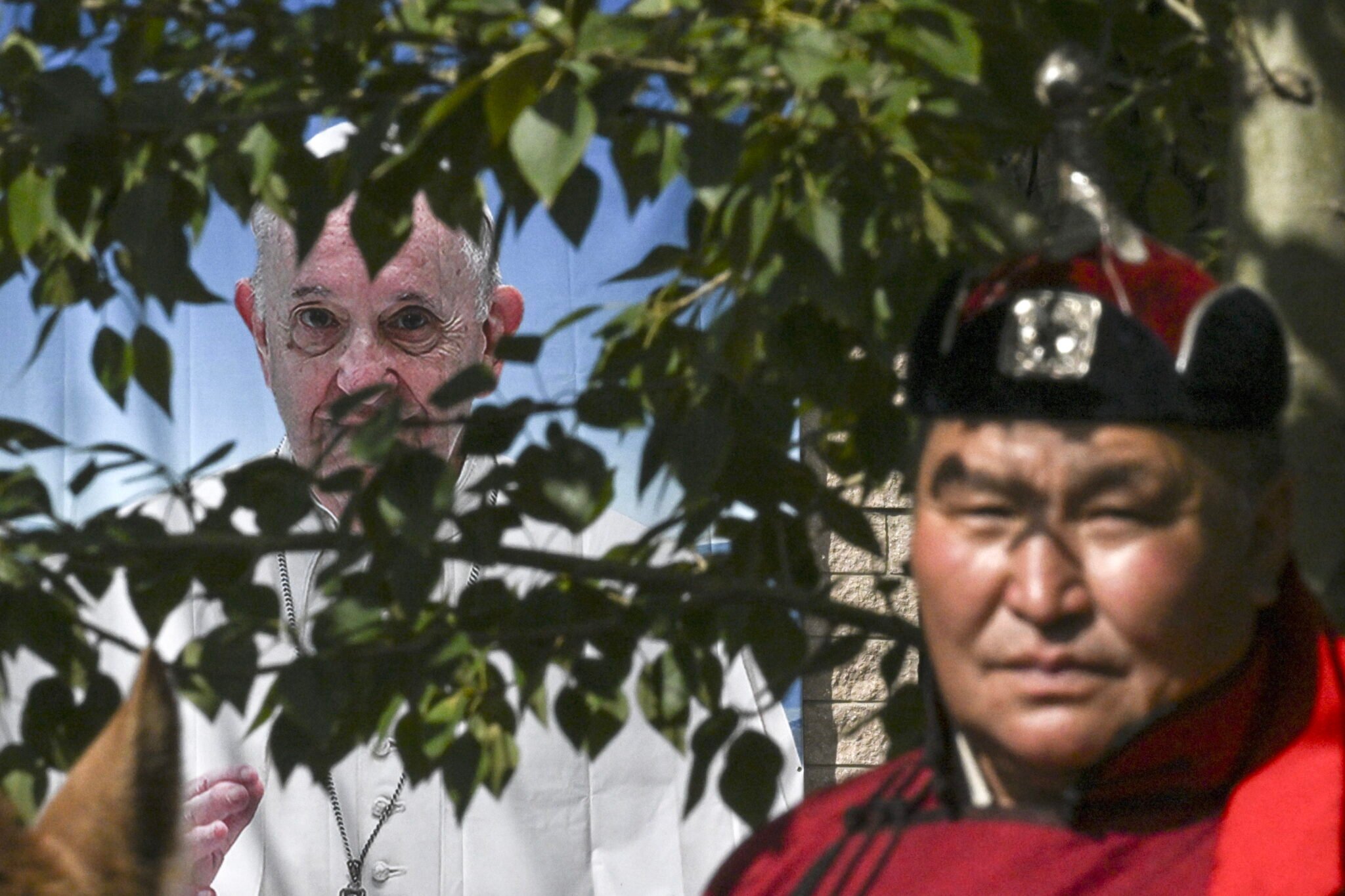 Ulaanbaatar (Mongolia), 02/09/2023.- A man stands by an image of Pope Francis during his visit to meet with bishops, priests, missionaries and consecrated persons, at the Saints Peter and Paul Catholic Cathedral, in Ulaanbaatar, Mongolia, 02 September 2023. Pope Francis landed on 01 September in Mongolia's capital Ulaanbaatar, starting his 43rd international Apostolic Journey to the predominantly Buddhist country until 04 September. (Papa, Obispo) EFE/EPA/CIRO FUSCO