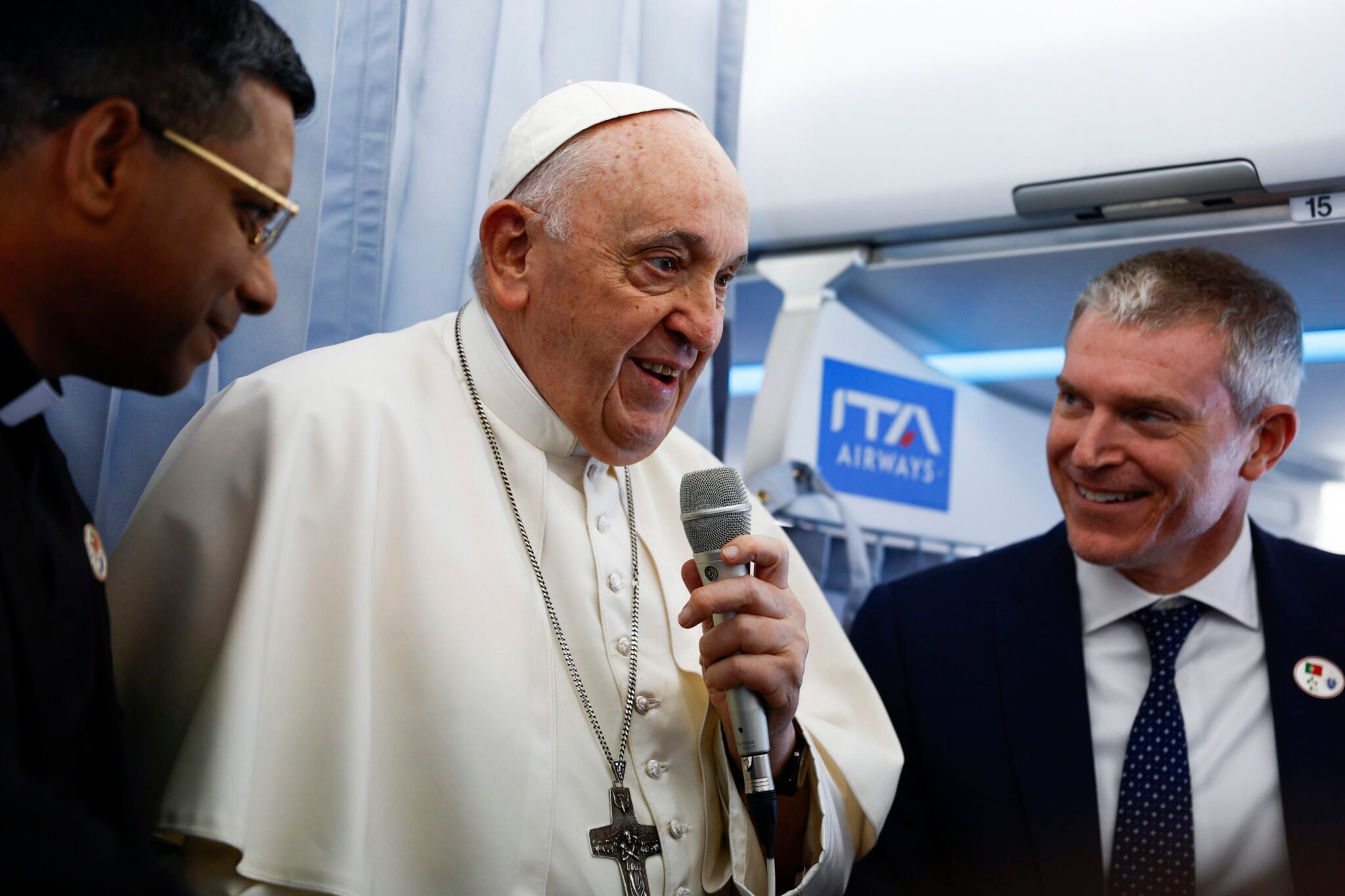 Mid-air (---), 02/08/2023.- Pope Francis talks with journalists aboard a flight from Rome to Lisbon to attend the World Youth Day 2023, 02 August 2023. (Papa, Lisboa, Roma) EFE/EPA/GUGLIELMO MANGIAPANE / POOL