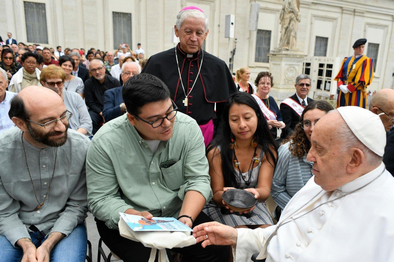 Lucy Urvina, desde Ecuador, entregó a Francisco una vasija de barro, “símbolo del trabajo de las mujeres amazónicas y alternativa para las comunidades que luchan contra el extractivismo minero”.