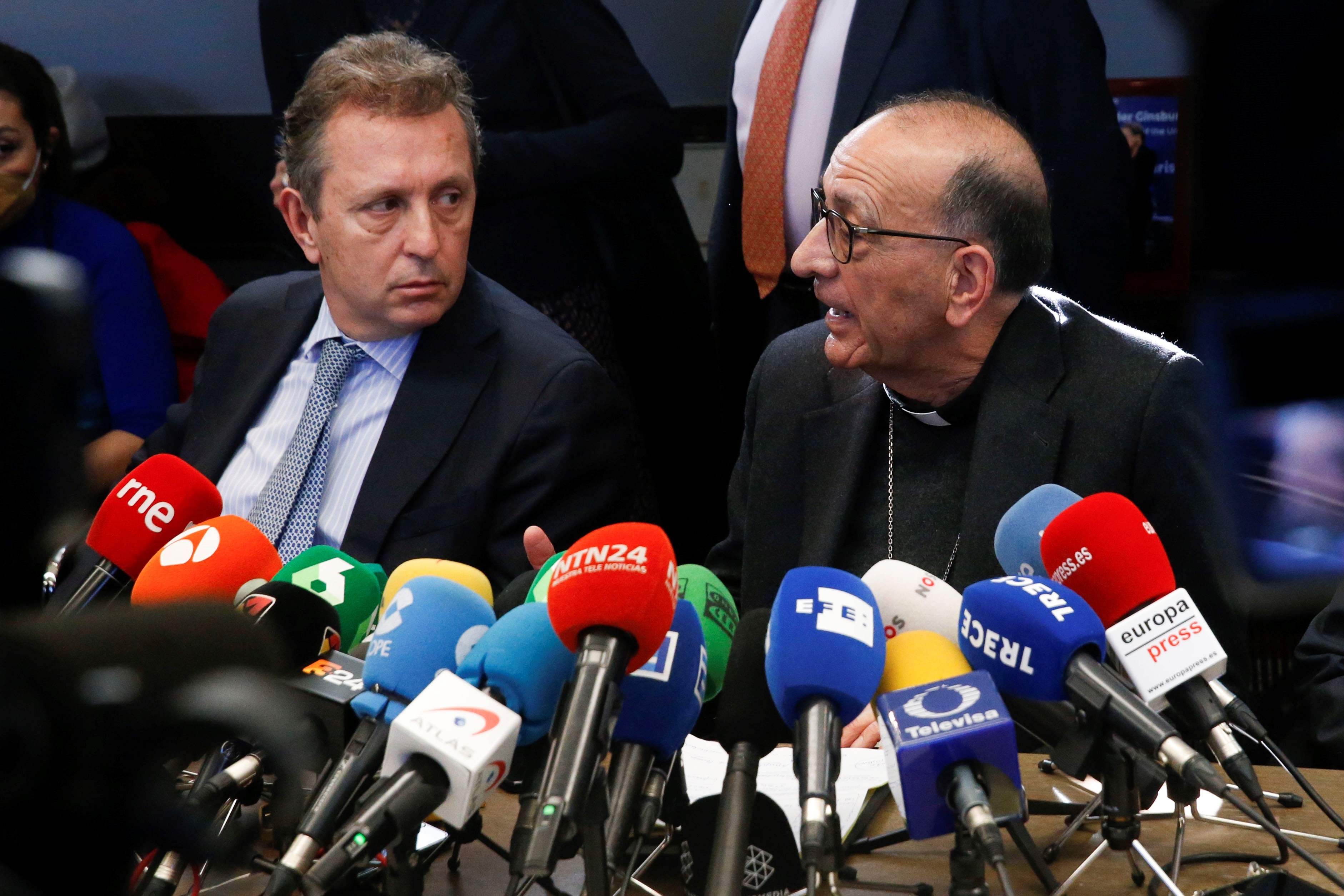 MADRID, 22/02/2022.- El presidente de la Conferencia Episcopal, Juan José Omella (d), y el presidente del despacho de abogados Cremades & Calvo Sotelo, Javier Cremades (i), explican en rueda de prensa la puesta en marcha de una auditoría independiente que estudiará las denuncias de abusos sexuales en el seno de la Iglesia católica. EFE/Diego Fernández