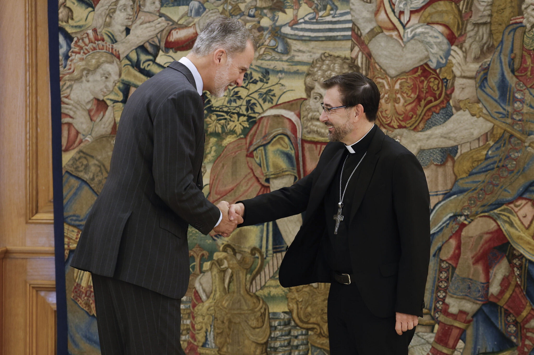 MADRID, 13/10/2023.- El rey Felipe VI saluda al arzobispo de Madrid, José Cobo (d), a quien ha recibido en audiencia este viernes en el Palacio de la Zarzuela, Madrid. EFE/ Chema Moya