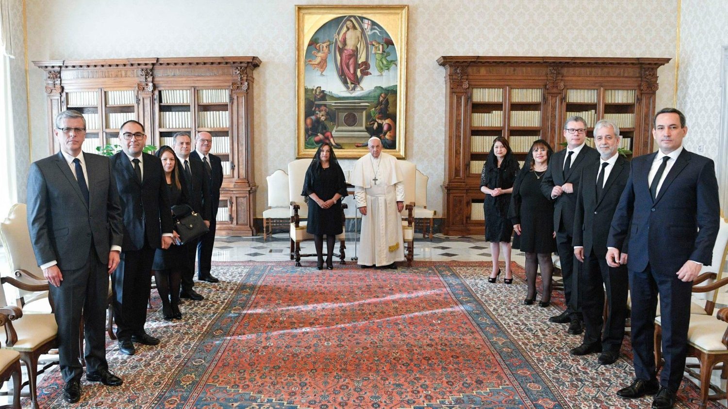 Francisco ha recibido a Dina Ercilia Boluarte Zegarra, presidenta de Perú, tras la destitución, enjuiciamiento y encarcelación de Pedro Castillo luego de su fallido intento por disolver el Parlamento.