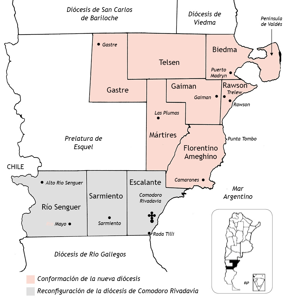 La nueva jurisdicción tiene una superficie de casi cien mil kilómetros cuadrados, más de 270 mil habitantes, y atenderá pastoralmente a las localidades de: Biedma, Gaiman, Florentino Ameghino, Mártires, Telsen, y la misma Rawson, ciudad capital de la provincia.