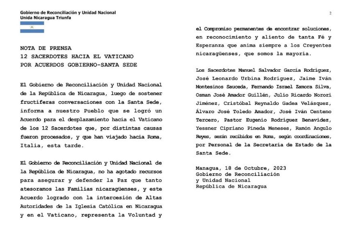 El gobierno de Nicaragua dio a conocer que 12 sacerdotes que permanecían detenidos fueron enviados a Roma, Italia, la tarde de este 18 de octubre, y su liberación se dio gracias a “fructíferas conversaciones con la Santa Sede”.