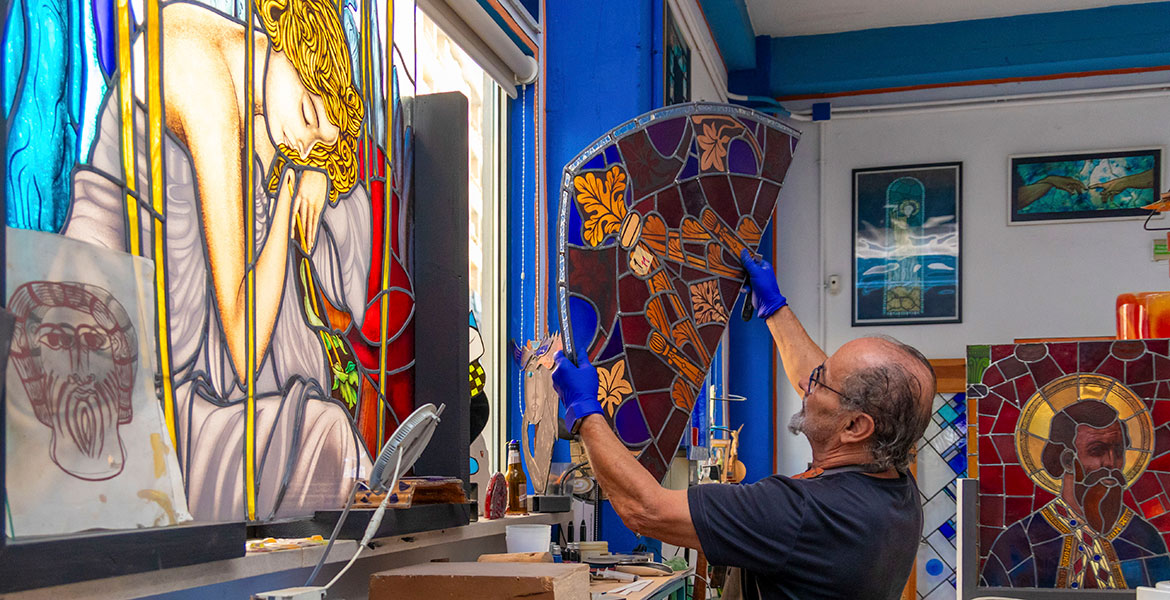Esa luz se renueva también con la restauración de los diecisiete vitrales superiores, pendiente desde 2005, cuando se renovaron los rosetones menores, trabajo que ejecuta también el maestro vidriero Tomás Saiz Castillo. “En esa calle donde está la iglesia de la Asunción viví desde los 5 años –explica el artista–. La iglesia es como mi casa y veía las vidrieras súper deterioradas, a falta de masilla, sin protecciones. Ya antes de la pandemia, se decidió que se iban a restaurar. Vino la pandemia, se paró otra vez. Son diecisiete ventanales y cada ventanal tiene dieciséis vidrieras en total. Las medidas más o menos son unos cinco metros por uno”.
