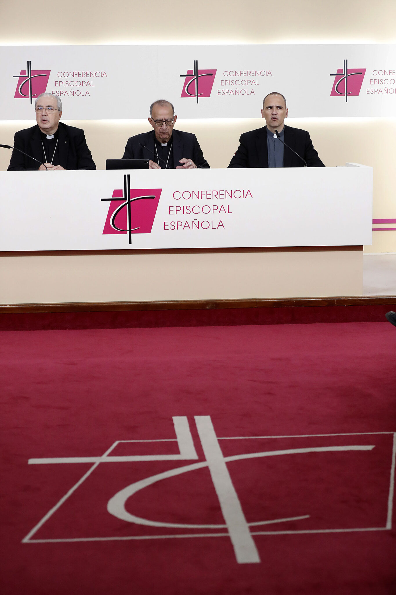 MADRID, 31/10/2023.- El presidente de la Conferencia Episcopal Española, Juan José Omella (c), y el presidente, Jesús Díaz Sariego (i), ofrece una rueda de prensa tras la Asamblea Plenaria extraordinaria para analizar el informe realizado por el Defensor del Pueblo sobre los abusos sexuales a menores en el seno de la Iglesia, este martes en Madrid. EFE/ J. P. Gandul