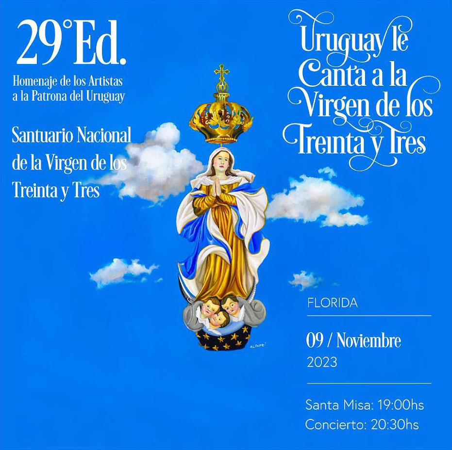 El próximo jueves 9 de Noviembre a las 20.30, se realizará un nuevo Homenaje a la Patrona de Uruguay, la Virgen de los Treinta y Tres, en el Santuario Nacional, la Catedral de Florida. Previamente, a las 19 se celebrará la Santa Misa.