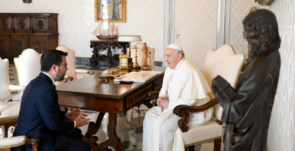 El presidente de la Generalitat de Cataluña, Pere Aragonès, se ha reunido esta mañana con el papa Francisco en una audiencia privada en el Vaticano. Ambos han conversado durante unos 40 minutos en una “reunión a solas, muy cordial, y en la que han podido compartir puntos de vista sobre distintos temas”, según ha informado el Govern.