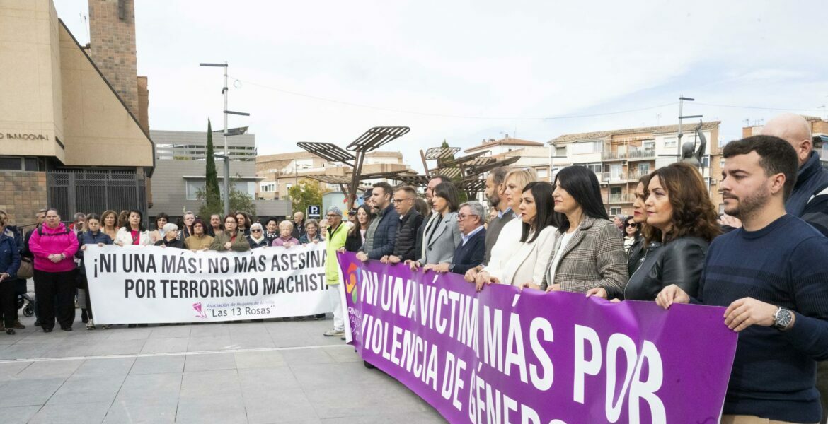ARMILLA (GRANADA), 08/11/2023.- Tras una pancarta con el lema "Ni una víctima más por violencia de género", más de un centenar de personas ha secundado la concentración convocada por el Ayuntamiento de Armilla (Granada) y ha guardado este mediodía un minuto de silencio contra el apuñalamiento sufrido anoche por una mujer de 47 años a manos de su exmarido, un hombre de 54 con el que mantenía periodos de convivencia y que está detenido mientras la víctima continúa en la UCI de un hospital de Granada en estado grave. EFE/Miguel Ángel Molina