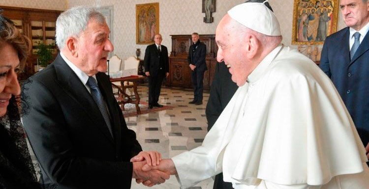 El papa Francisco ha recibido esta mañana en audiencia, en el Palacio Apostólico Vaticano, al presidente de la República de Irak, Abdul Latif Jamal Rashid, acompañado de la primera dama, Shanaz Ibrahim Ahmed. Los dos jefes de Estado han conversado 25 minutos, durante los que han compartido su preocupación por el conflicto entre Israel y Palestina.