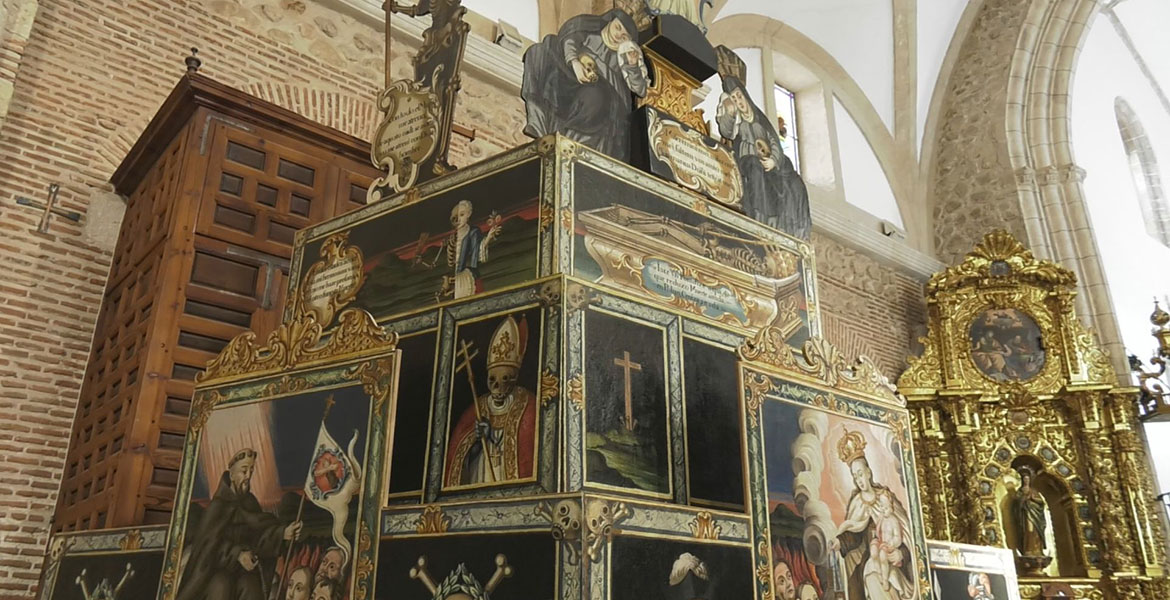 Los catafalcos tuvieron su época de máximo esplendor durante el Barroco. Se construyeron entonces verdaderas obras de arte, arquitectura efímera que se elevaba varios metros en el interior de las iglesias, pero con el tiempo esta práctica fue cayendo en desuso. Razón de peso para que el de La Torre de Esteban Hambrán sea todavía más excepcional, con una particularidad especialmente llamativa: fueron los propios vecinos, allá por 1980, los que decidieron recuperar esta costumbre. Desmontado y guardado en un cajón, volvió a cobrar vida para ser expuesto únicamente en noviembre, el mes asociado al recuerdo y oración por los fieles difuntos.