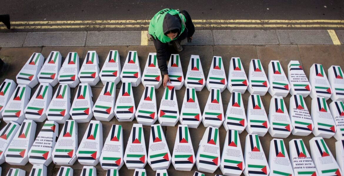 London (United Kingdom), 30/11/2023.- A Pro-Palestinian protester lays over 450 symbolic children's coffins in remembrance of the children killed in Gaza, outside Downing Street in London, Britain, 30 November 2023. Pro-Palestinians demonstrators protested against what they called 'Israel's indiscriminate bombardment of Gaza'. Thousands of Israelis and Palestinians have died since the militant group Hamas launched an unprecedented attack on Israel from the Gaza Strip on 07 October, and the Israeli strikes on the Palestinian enclave which followed it. More than 6,150 children have been killed since the outbreak of war between Israel and Hamas, according to the Gaza Government media office. (Protestas, Reino Unido, Londres) EFE/EPA/TOLGA AKMEN