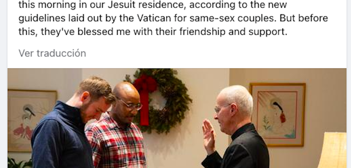 “Queridos amigos: Tuve el honor de bendecir a mis amigos Jason y Damian esta mañana en nuestra residencia jesuita, de acuerdo con las nuevas pautas del Vaticano para parejas del mismo sexo. Pero antes de esto, me han bendecido con su amistad y apoyo”. Con estas palabras cargadas de emoción anunciaba James Martin, a través de Facebook, que apenas 24 horas después de que el Dicasterio para la Doctrina de la Fe publicase la declaración ‘Fiducia Supplicans’, él ya ponía en práctica aquello a lo que el Vaticano ha dado luz verde: bendecir a las parejas del mismo sexo.