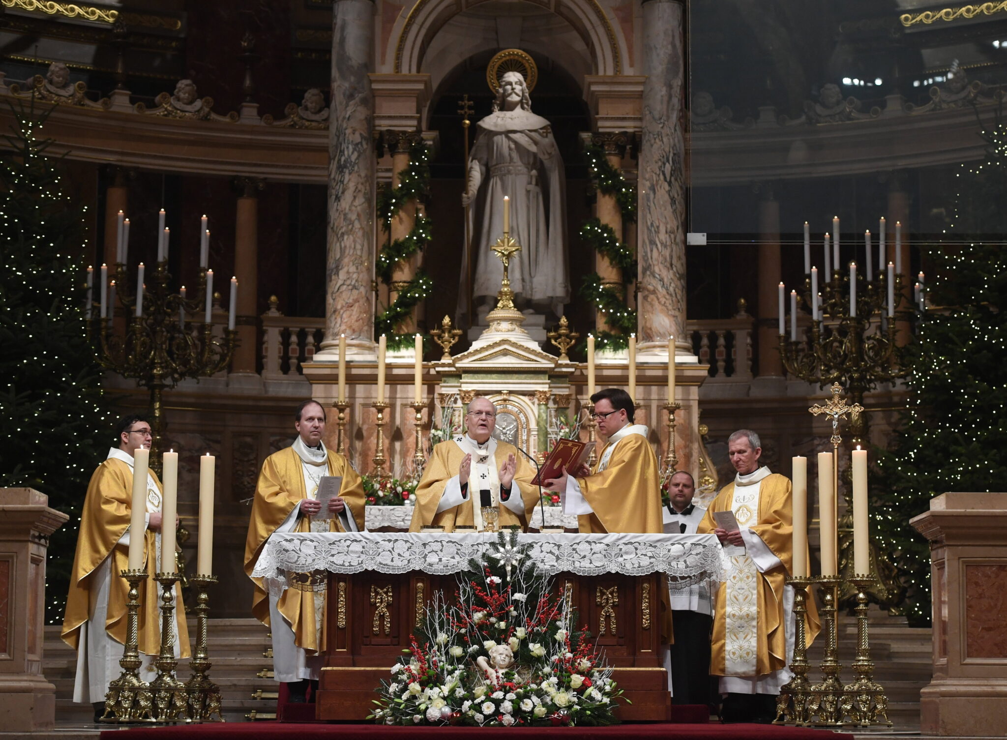 Budapest (Hungary), 25/12/2023.- Primate of the Hungarian Catholic Church, Archbishop of Esztergom-Budapest, Cardinal Peter Erdo (C) celebrates the Christmas midnight mass in St. Stephen Basilica in Budapest, Hungary, 25 December 2023. (Obispo, Cardenal, Hungría) EFE/EPA/Attila Kovacs HUNGARY OUT