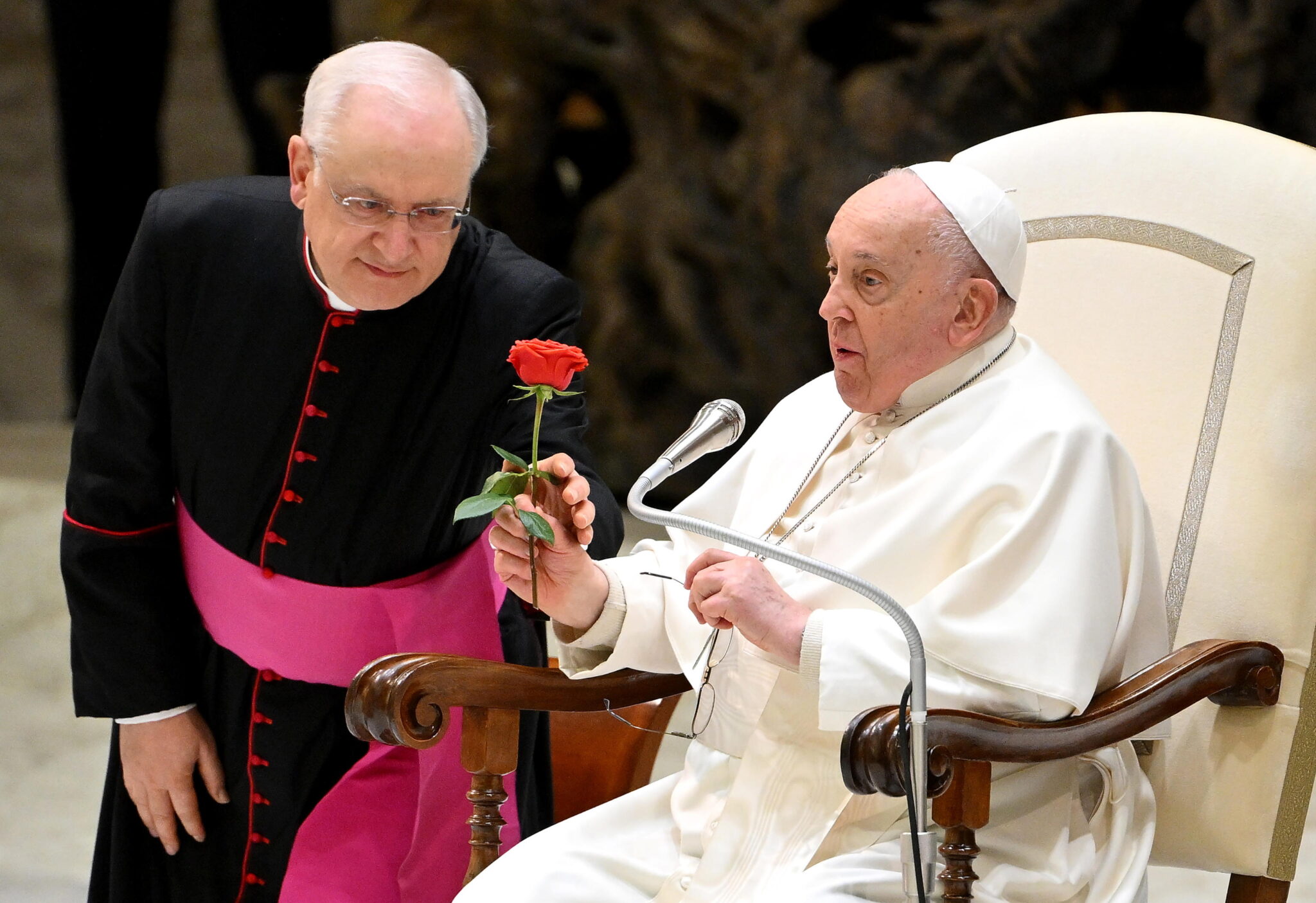 Vatican City (Italy), 17/01/2024.- Pope Francis (R), holds a rose flower next to Italian priest and writer Monsignor Leonardo Sapienza (L), as he leads the weekly general audience in the Paul VI hall, Vatican City, 17 January 2024. (Papa) EFE/EPA/ETTORE FERRARI