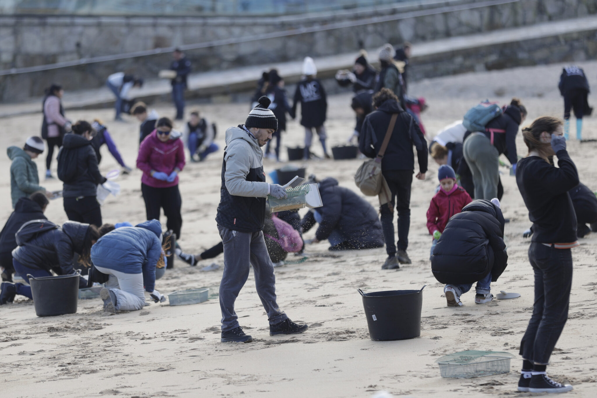 A CORUÑA, 21/01/24.- Voluntarios convocados por la plataforma WE sustainabilty y el grupo naturalista Hábitat han llevado a cabo este domingo una recogida de pellets de plástico en la playa de San Amaro, situada en la ciudad de A Coruña, donde un centenar de personas han intentado limpiar estas pequeñas esferas de plástico que continúan llegando a las costas de Galicia. EFE/Cabalar