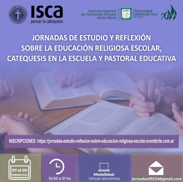 El Instituto Superior de Catequesis Argentino (ISCA) y la Universidad Católica de Cuyo (UCCuyo) invitan a participar de unas jornadas de estudio y reflexión sobre la Educación Religiosa Escolar (ERE), Catequesis en la Escuela y Pastoral Educativa para pensar esta temática en todo el país.