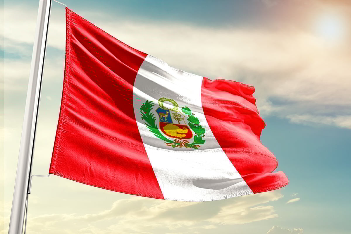 Peru national flag cloth fabric waving on the sky with beautiful sun light