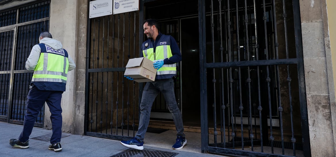 GRAFCVA7874. VALENCIA, 23/01/2024.- Agentes de la Policía Nacional salen del edificio donde investigan las circunstancias de la muerte del canónigo emérito de la Catedral de València Alfonso López Benito, cuyo cuerpo sin vida ha sido hallado este martes por la mañana en su domicilio del centro de la ciudad, muy próximo a la seo. EFE/Biel Aliño
